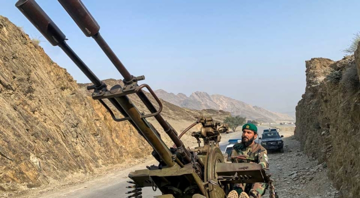 A Taliban security personnel operating an anti-aircraft gun keeps watch for Pakistani airstrikes near the Torkham border crossing between Afghanistan and Pakistan in the Nangarhar province on February 27, 2026 following overnight cross-border fighting between the two countries. Photo by AIMAL ZAHIR / AFP