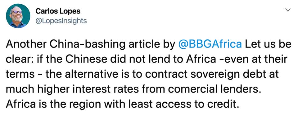 University of Cape Town professor, Carlos Lopes, was among the first today to post a rebuttal to the Bloomberg China-Africa debt article. Professor Lopes expressed frustration that the article only focused on the negative aspects of China’s lending practices on the continent and appeared to overlook the critical point that had African countries borrowed from private capital markets instead, it would have been much more expensive.