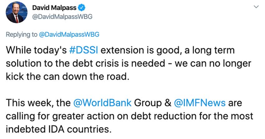 David Malpass isn’t that happy with the G20’s latest iteration of its Debt Service Suspension Initiative that delays loan repayments an extra six months until June 2021. The World Bank president is calling for more than just a repayment holiday, he also wants to see actual debt cancellation so the overall debt stock is reduced.