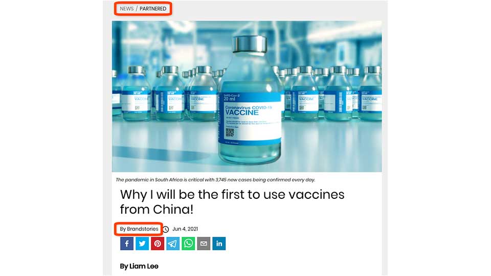 Some unknown Chinese entity in South Africa, most likely the embassy in Pretoria, is using paid content to promote Chinese vaccines in local media. Beyond the fact that this is obviously propaganda, it’s not clear from the article who the author is or who actually paid for the placement in IOL’s “Brand Stories” section of its website.