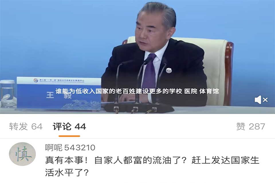 This comment has drawn angry reactions from Chinese internet users, a rare moment of public resistance to the government’s international engagement from citizens suffering tough economic times at home. Under Weibo video clips of Wang’s comments, many users posted, “Who will pay for it?”