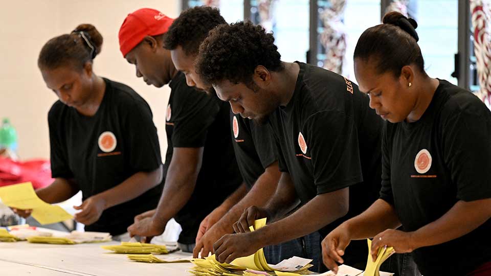 Electoral officers count votes in the general election at the Multi-Purpose Center in Honiara, capital city of the Solomon Islands, on April 19, 2024. Saeed KHAN / AFP