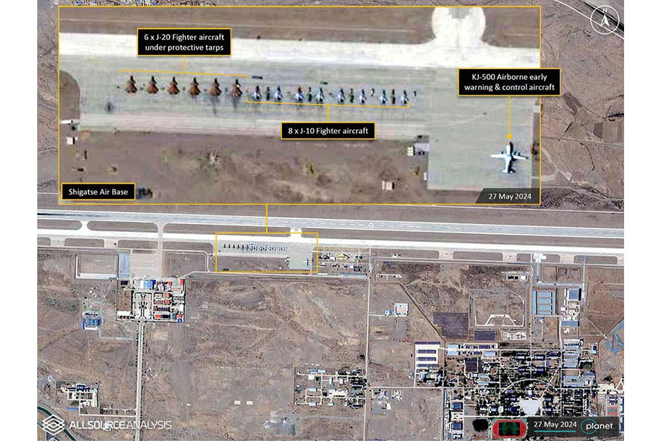 The photos were taken on May 27th at the Shigatse dual-use airport and revealed a squadron of six J-20 stealth fighter jets, the PLAAF’s most advanced aircraft, along with eight J-10s and a KJ-500 early warning and control plane that operates much like a U.S. AWAC.
