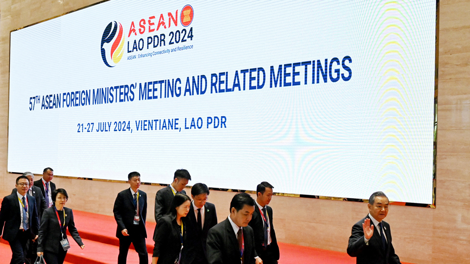 China's Foreign Minister Wang Yi (R) waves as he arrives to attend the Association of Southeast Asian Nations (ASEAN) Post Ministerial Conference with China in Vientiane on July 26, 2024. TANG CHHIN Sothy / AFP