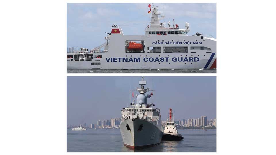 (TOP) A Vietnam Coast Guard vessel taking part in joint exercises with the Philippines Coast Guard and (BOTTOM) a Vietnamese missile frigate arriving at the port of Zhanjiang in China's southern Guangdong province on the same weekend. Images via AFP (TOP) and Xinhua (BOTTOM).