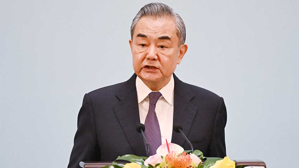 China's Foreign Minister Wang Yi speaks at a ceremony marking the 70th anniversary of the Five Principles of Peaceful Coexistence, at the Diaoyutai State Guesthouse in Beijing on June 28, 2024. GREG BAKER / AFP