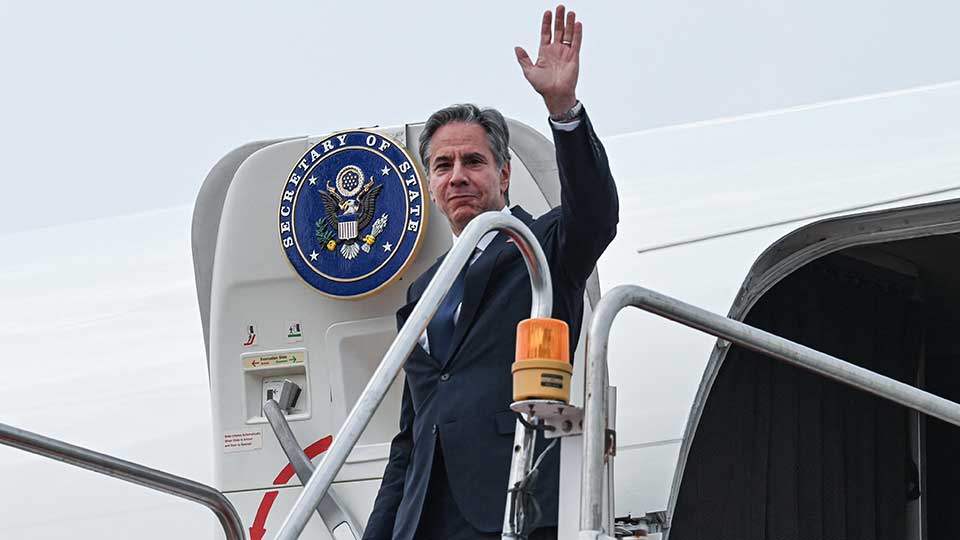 In a shift of focus after exhaustive diplomacy on the Middle East crisis, the top US diplomat landed in Vientiane, where he will represent the United States at the annual Southeast Asian-led meetings, which President Joe Biden is skipping for the second straight year.