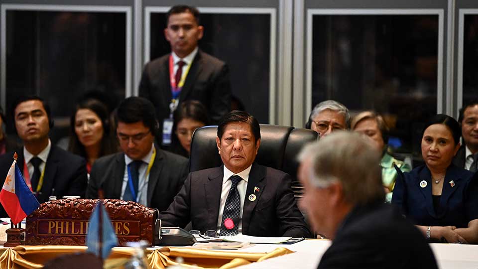 Philippines' President Ferdinand Marcos Jr (C) watches United Nations Secretary General Antonio Guterres (front R) speak at the 14th ASEAN-United Nations Summit during the 44th and 45th Association of Southeast Asian Nations (ASEAN) Summits in Vientiane on October 11, 2024. NHAC NGUYEN / AFP