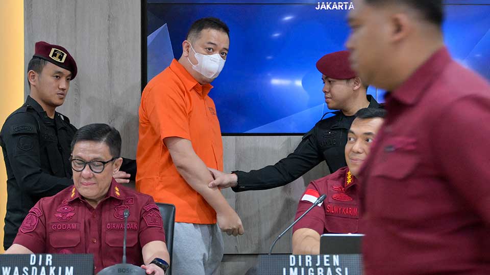 A man, only identified as LQ and his alias JL, is escorted as he is handed over from immigration authorities to the police in Jakarta on October 10, 2024. BAY ISMOYO / AFP