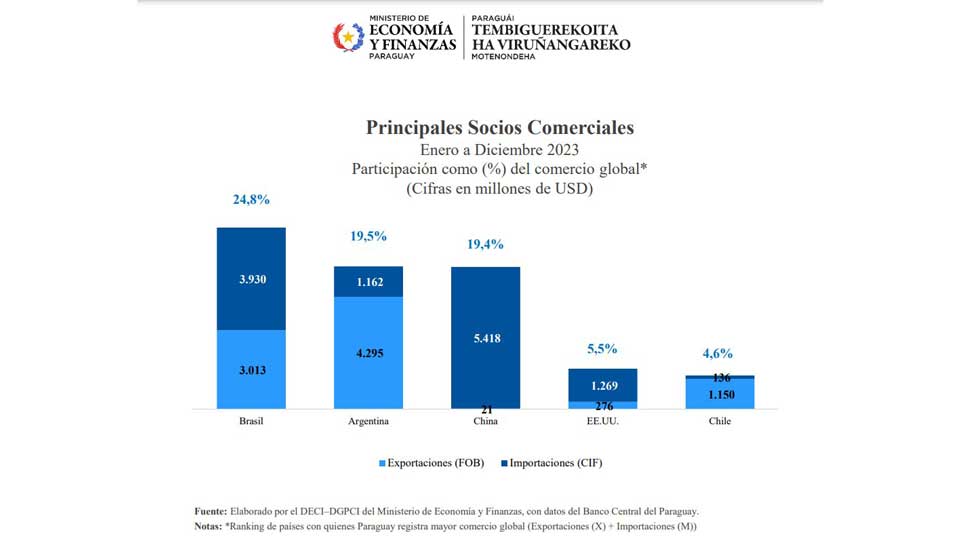 China is Paraguay’s third largest trading partner, with goods that only flow in one direction. Chinese imports into Paraguay account for almost 20% of Paraguay’s total trade, with no Paraguayan products flowing in the other direction, according to 2023 data from the Ministry of Economy and Finance in Asunción.
