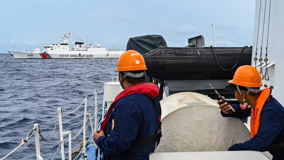 A file image of Philippine Coast Guard personnel monitoring a Chinese Coast Guard vessel in the South China Sea in August. Photo: Jam Sta Rosa / AFP.