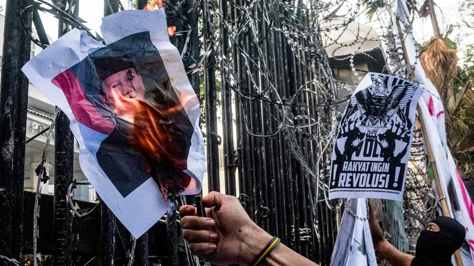 A demonstrator sets on fire a poster of Indonesia’s President Prabowo Subianto during a protest demanding police reform and the dissolution of the parliament, in Bandung, West Java on September 1, 2025. (Photo by Timur Matahari / AFP)