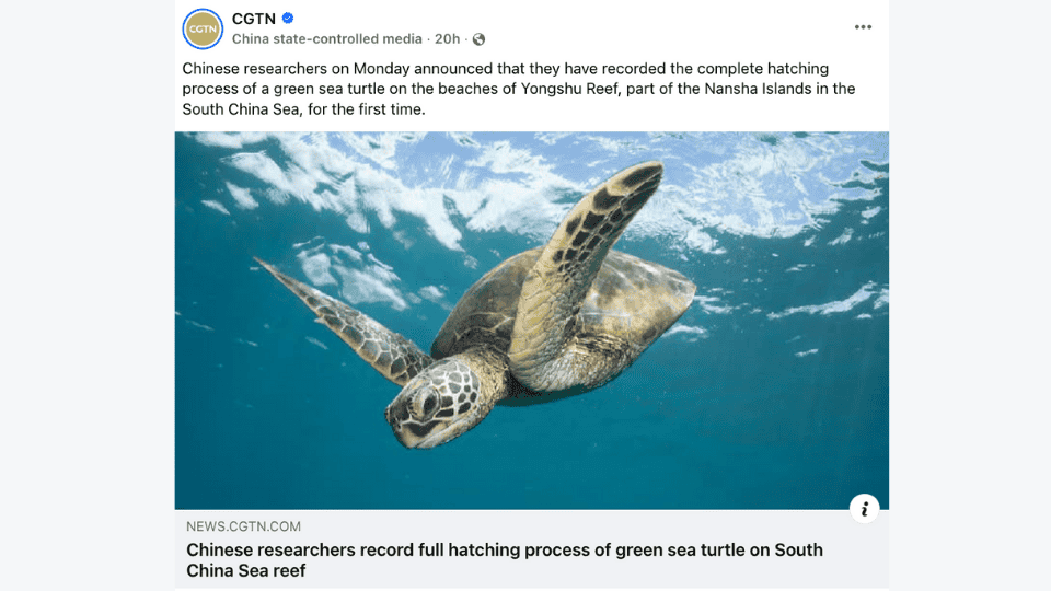 A CGTN Facebook post of a Xinhua environmental story in the South China Sea