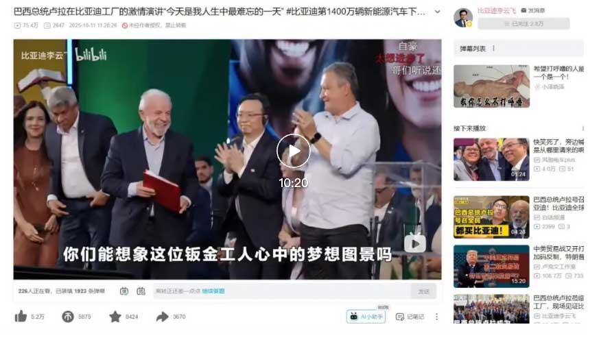 He also released a speech urging Brazilians to buy BYD cars, and videos of that speech quickly went viral in China.