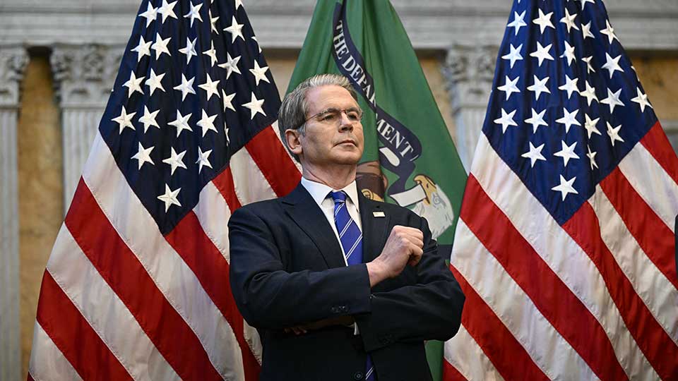 US Treasury Secretary Scott Bessent looks on as US Trade Representative Jamieson Greer (not pictured) delivers remarks on "Game Plan for US Investment" on the sidelines of the IMF/World Bank annual meetings at CNBC Invest in America Forum, in Washington, DC on October 15, 2025. (Photo by Brendan SMIALOWSKI / AFP)