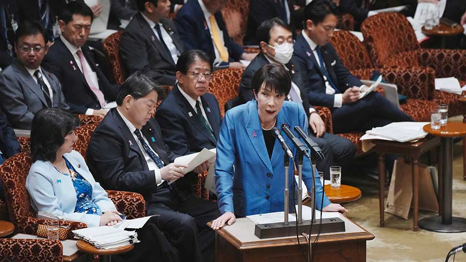 Japan's Prime Minister Sanae Takaichi (C) answers a question during a session of the House of Councillors Budget Committee at the National Diet in Tokyo on November 12, 2025. (Photo by Kazuhiro NOGI / AFP)