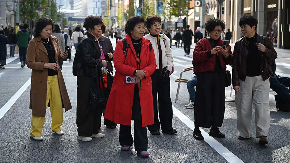 Chinese tourists tour the Ginza shopping district of Tokyo on November 16, 2025. Photo by GREG BAKER / AFP