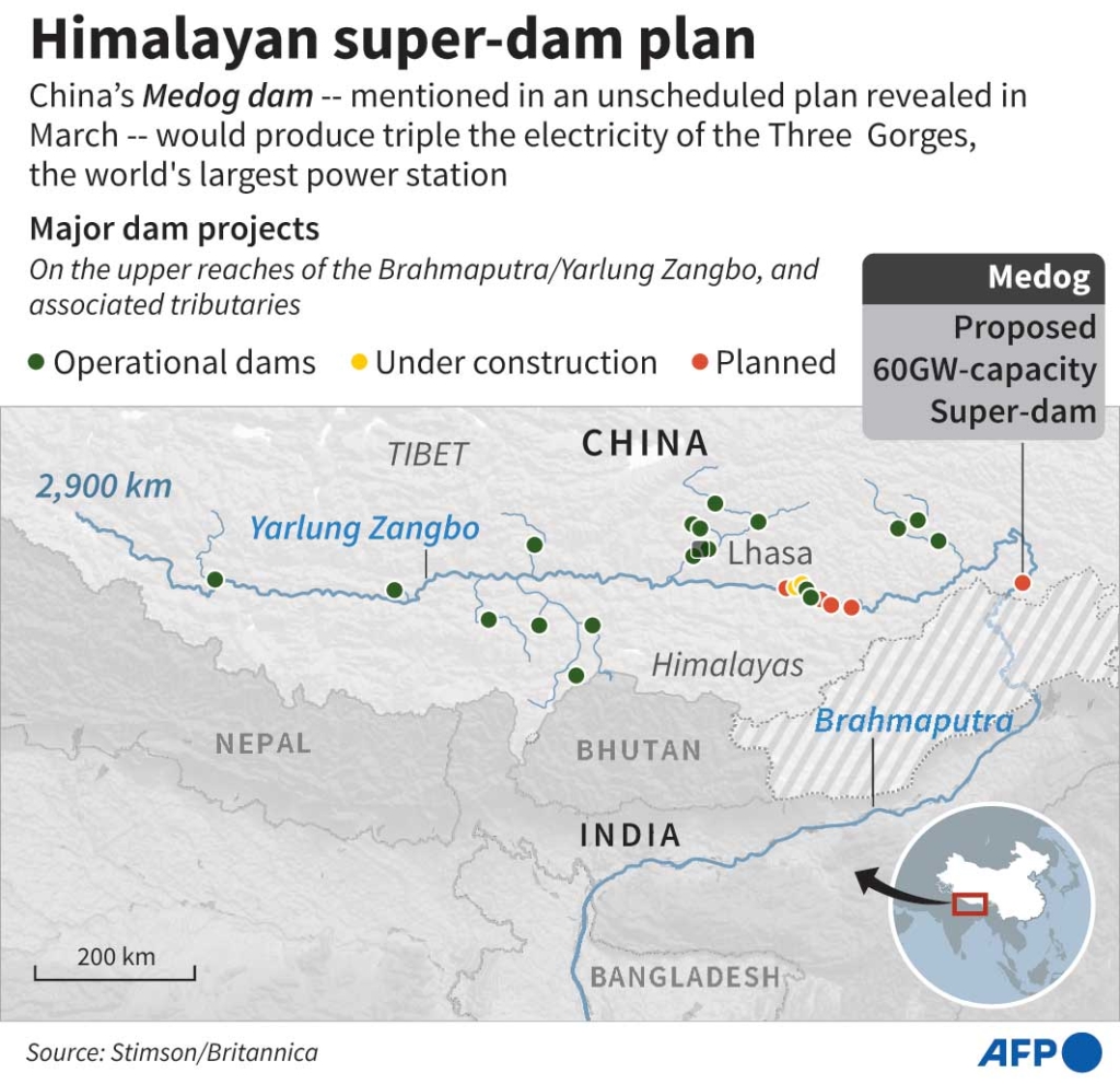 The planned Metog hydropower station sits on the “Great Bend” of the Yarlung Tsangpo, where the river drops 2,000 meters within a 50-kilometer stretch. It is considered one of the world’s richest sites in water and energy resources. The dam’s proposed capacity is 60 gigawatts, roughly three Three Gorges Dams.