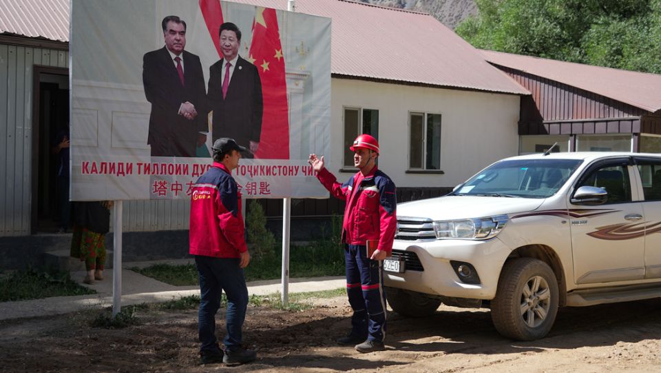 Workers of Talco Gold, the joint Tajik-Chinese mining firm, interact in front of a billboard-sized poster bearing a picture of China's leader Xi Jinping and Tajikistan's President Emomali Rakhmon at the Saritag antimony mine in western Tajikistan on August 26, 2025. (Photo by STRINGER / AFP)