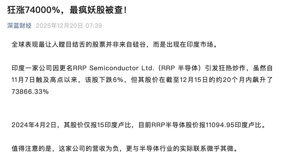 Chinese social media has been buzzing with disbelief and humor over India’s latest stock market frenzy, RRP Semiconductor Ltd., a company whose skyrocketing stock is almost entirely divorced from its real operations. The share price of RRP Semiconductor has surged by an eye-popping 55,000 percent over the past 20 months, making it one of the world’s most spectacularly performing stocks, despite reporting negative revenue, only two full-time employees, and no actual semiconductor production. Some media even call it a ‘crazy demon stock.’