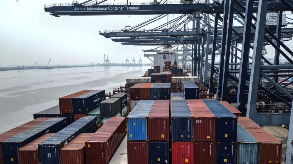 An aerial view shows cargo containers stacked aboard a ship at Jakarta International Container Terminal at Tanjung Priok Port in Jakarta on Aug. 7, 2025. China remained Indonesia’s top export market and import source as Indonesia posted a $38.54 billion trade surplus in Jan-Nov 2025, BPS said. (AFP photo)