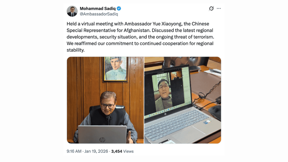 Mohammad Sadiq and Yue Xiaoyong, Pakistan and China’s special envoys for Afghanistan, held an online meeting to discuss the declining security situation in the country. The talks covered growing threats of terrorism, regional stability, and ongoing security cooperation.