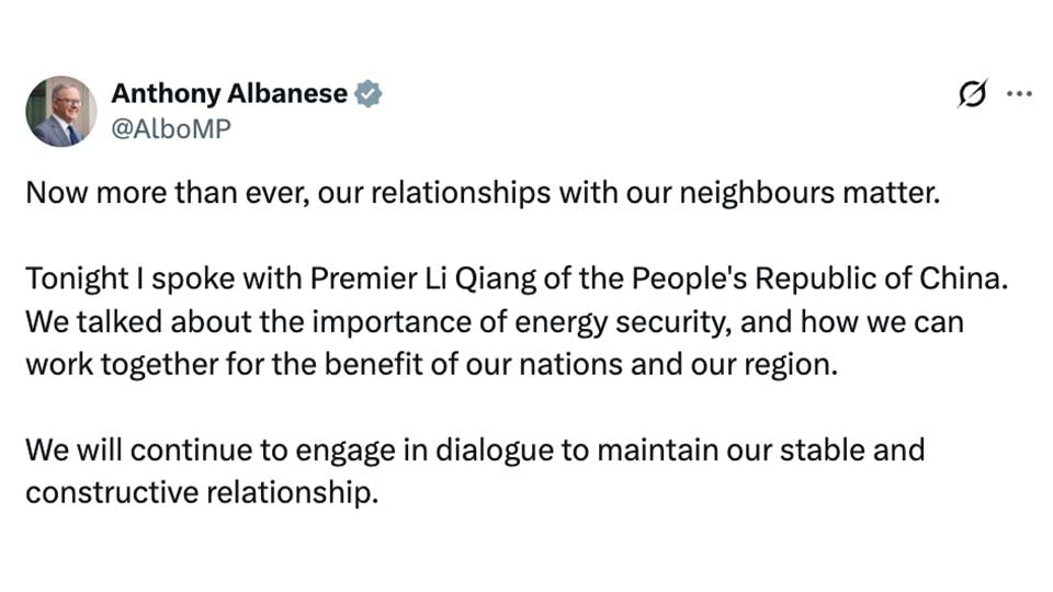 Australia’s Prime Minister Anthony Albanese held a telephone call with Chinese Premier Li Qiang to discuss the importance of energy security “in light of the current global challenges”, according to a Canberra summary of their conversation.