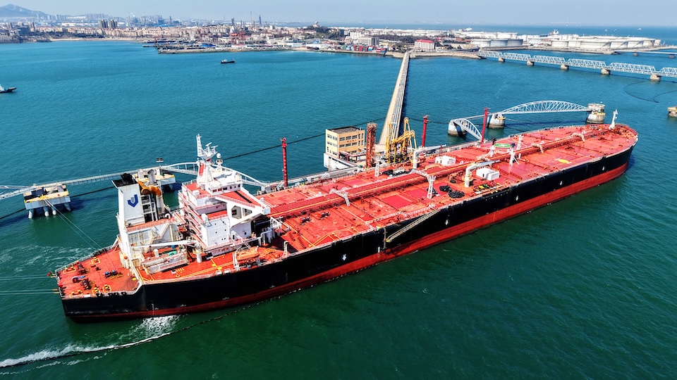 An oil tanker unloads imported crude oil at the Qingdao Port Oil Terminal in Shandong Province, China, on April 4, 2026. The U.S. said it believed China would pause Iran oil purchases as Washington enforces a maritime blockade on Iran. Photo / Costfoto/NurPhoto via AFP