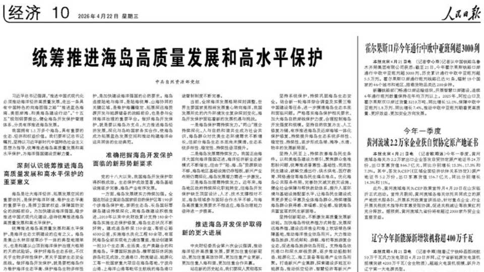 Image of a People's Daily newspaper article with the headline: "Coordinate and advance both high-quality development and high-level protection of island regions."