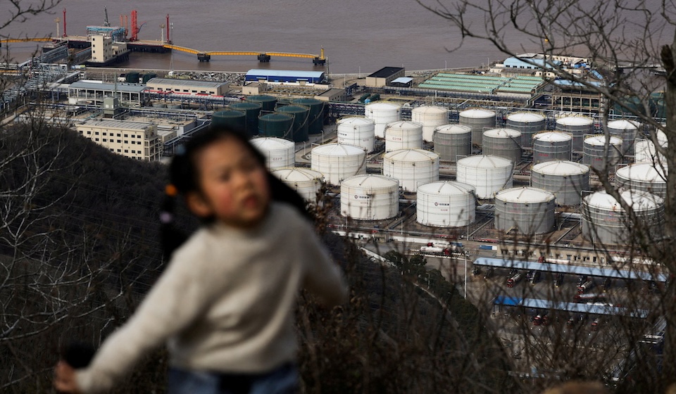 A child walks along a hiking trail with oil storage tanks and facilities of CNOOC Ningbo Daxie Petrochemical Co., Ltd. in the background in Ningbo, Zhejiang, China, March 21, 2026. REUTERS/Go Nakamura/File Photo