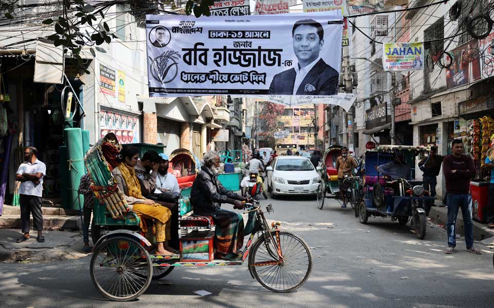 A rickshaw passes by an election campaign banner of Bangladesh Nationalist Party (BNP) candidate Bobby Hajjaj, ahead of the national election, in Dhaka, Bangladesh, February 9, 2026. REUTERS/Mohammad Ponir Hossain