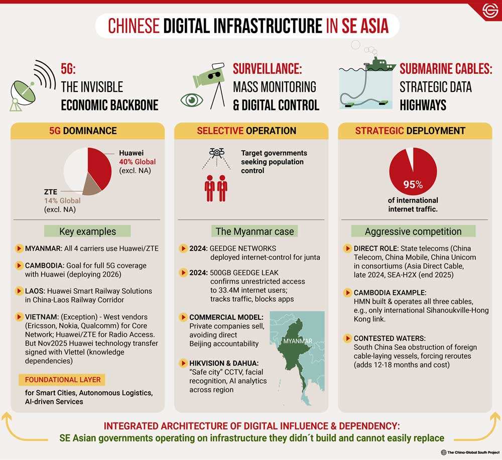 Globally (excluding North America), Huawei holds approximately40% of the telecom equipment market, with ZTE at 14%. The result is a market already structured around Chinese infrastructure. All four of Myanmar’s mobile carriers run Huawei or ZTE equipment. Cambodia’s government has pledged to achieve full 5G coverage with Huawei as the primary contractor, the deployment kicking off in 2026.