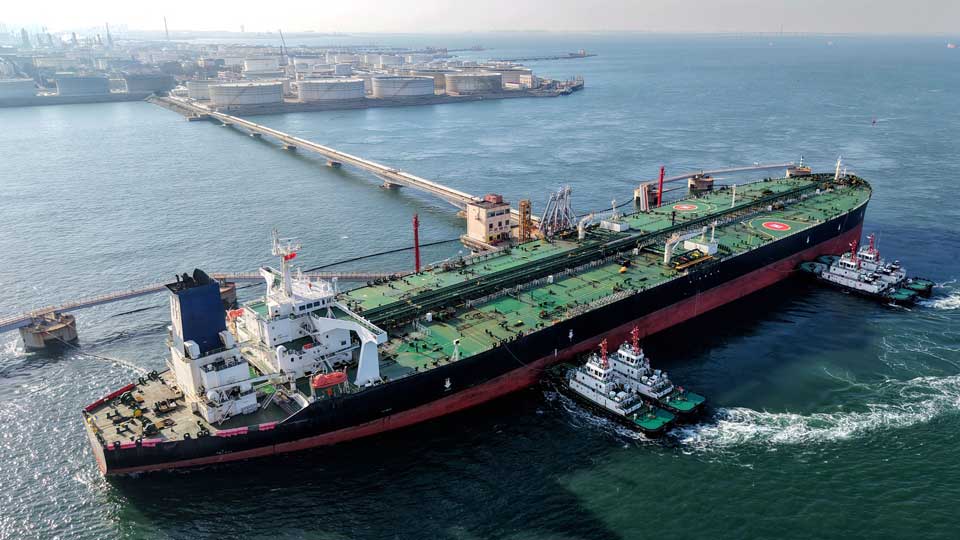 A crude oil tanker berths at the crude oil terminal at the port in Qingdao, in China’s eastern Shandong province on March 19, 2026. (Photo by CN-STR / AFP)