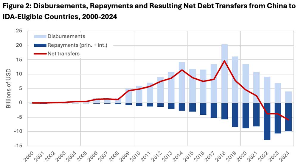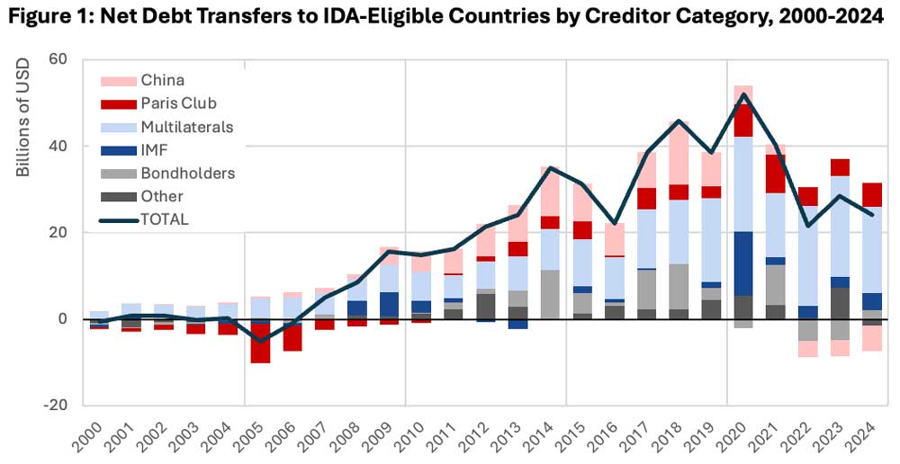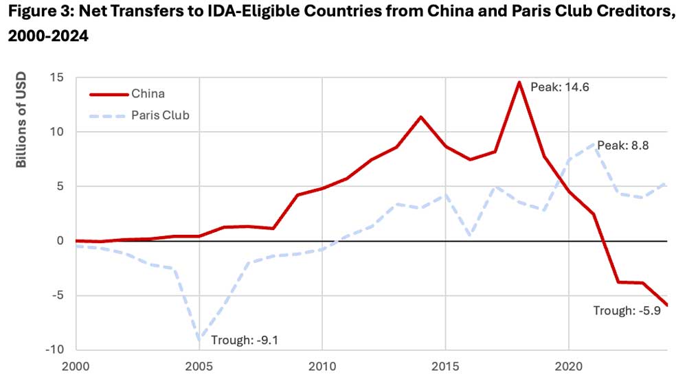 It is important to note that these trends are not unprecedented or even particularly unusual. For example, when Paris Club creditors were experiencing financial volatility associated with the real estate bubble of the mid-2000s, their net transfers to IDA countries similarly reversed. As Figure 3 shows, Paris Club net transfers hit a trough of -$9.4 billion in 2005, a shockwave that swamped the value of China’s net transfers of -$5.9 billion in 2024.