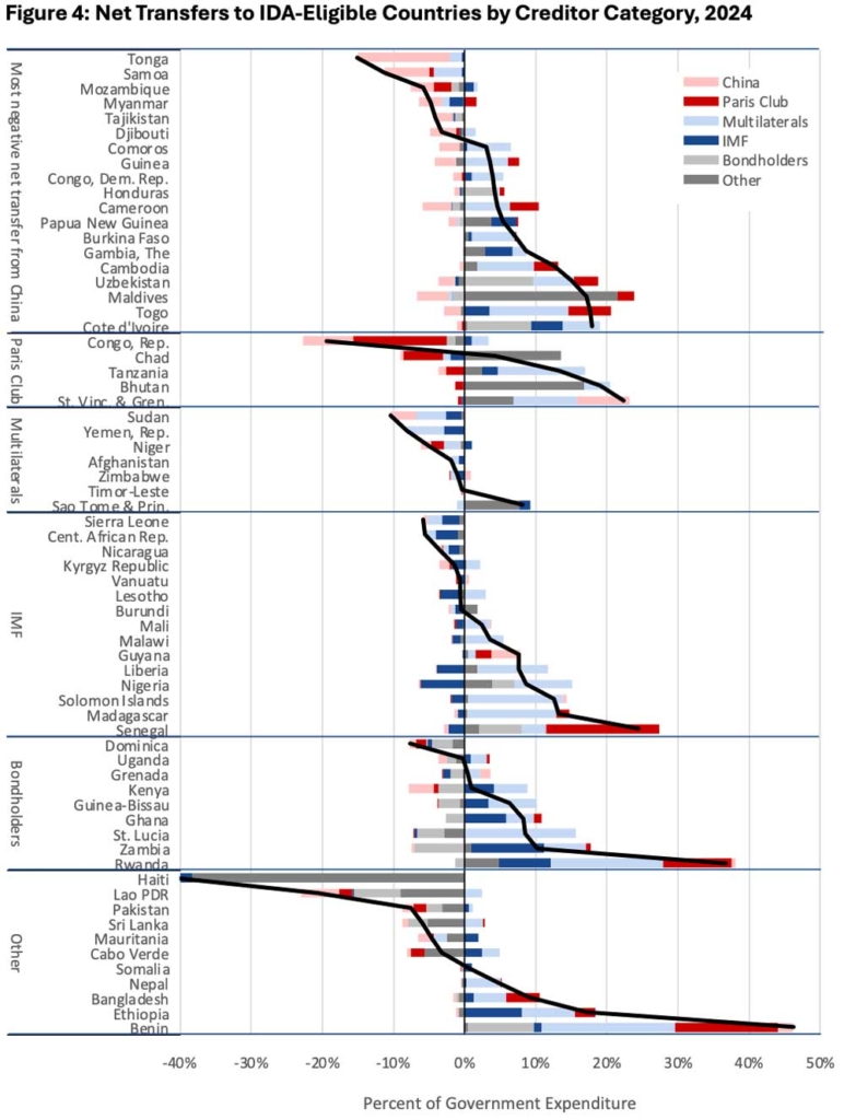 Furthermore, the impact of China’s negative net transfers is concentrated among a few countries. To explore this distribution in more detail, Figure 4 shows each IDA country’s net debt transfers from each category of creditors, as well as their total net debt transfers overall, as a share of their government expenditure in 2024. For the 19 countries shown at the top of Figure 3, the most negative net transfer came from China. However, most of those 19 countries recorded positive net transfers overall, meaning they offset negative net transfers from China with positive net transfers from other lenders.