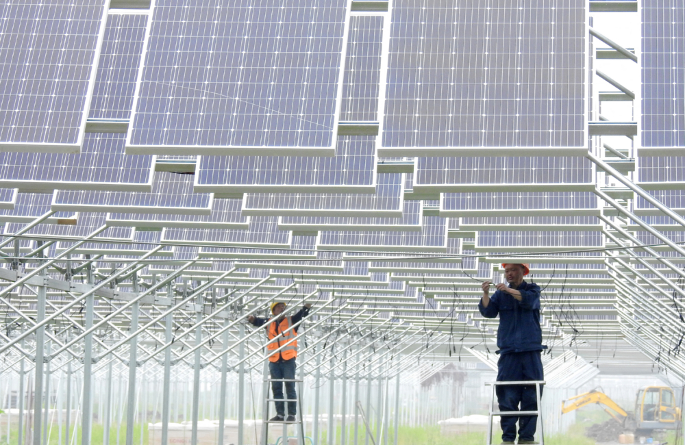 FILE PHOTO: Workers install solar panels in Lianyungang, Jiangsu province, China May 15, 2018. REUTERS/Stringer ATTENTION EDITORS - THIS IMAGE WAS PROVIDED BY A THIRD PARTY. CHINA OUT./File Photo