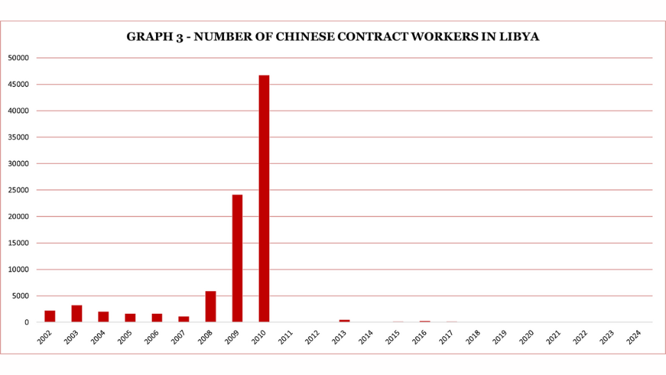 Before the conflict, Beijing was a major importer of Libyan oil (see graph 1), and Chinese state-owned enterprises were deeply involved in construction, energy, and infrastructure projects nationwide (see graph 2). However, an unintended risk of this mutually profitable partnership was that tens of thousands of Chinese nationals were on Libyan soil when war broke out (see graph 3). Their safety was an immediate concern for Beijing, which mounted an unprecedented response: in March 2011, China carried out its largest overseas evacuation, extracting more than 35,000 citizens from Libya, an active war zone thousands of kilometers from its borders.