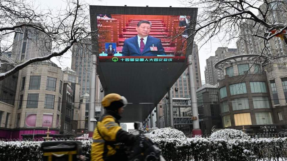 A screen shows Chinese President Xi Jinping during the opening session of the National People’s Congress (NPC) at the Great Hall of the People, in Beijing on March 5, 2026. (Photo by ADEK BERRY / AFP)