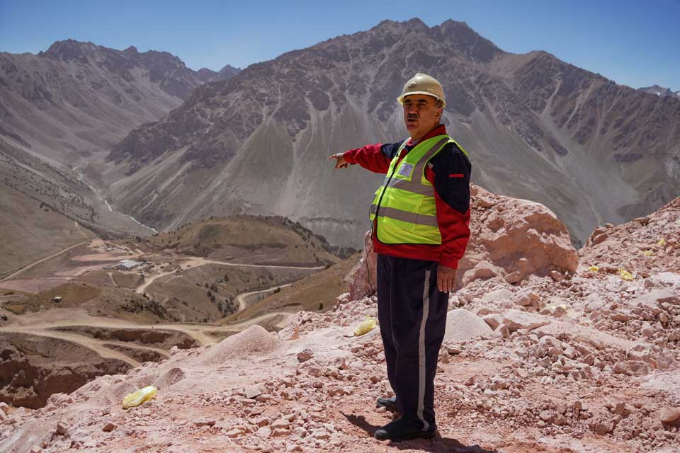 Murod Dzhumazoda, deputy director of Talco Gold, the joint Tajik-Chinese mining firm, guides AFP reporters at the Saritag antimony mine in western Tajikistan on August 26, 2025. AFP