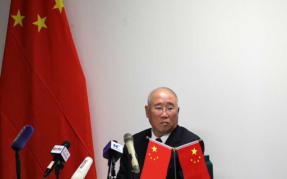 China's special climate envoy Xie Zhenhua gives a press conference at the United Nations climate summit in Dubai on December 9, 2023. Giuseppe CACACE / AFP