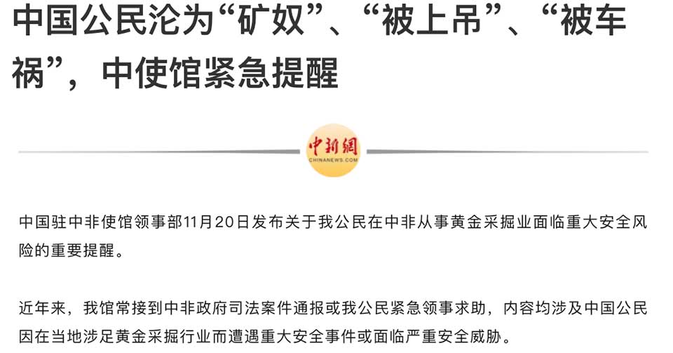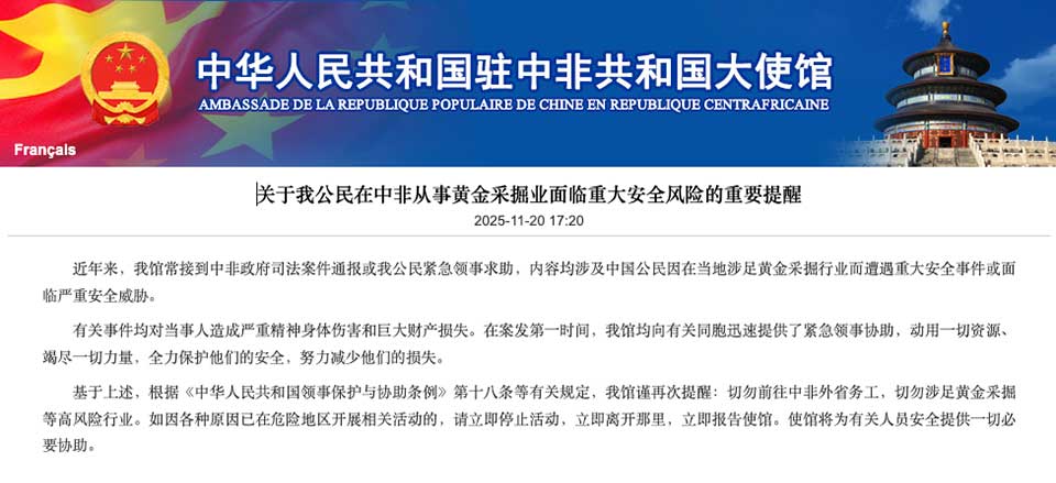 The Chinese embassy in the Central African Republic issued one of its strongest warnings to date last week about the extreme dangers facing Chinese nationals involved in gold mining in the Central African Republic (CAR). The warning circulated widely on Chinese news platforms, prompting reactions that expose both the domestic pressures behind risky, resource-driven emigration and the expectations placed on Chinese and African governments.