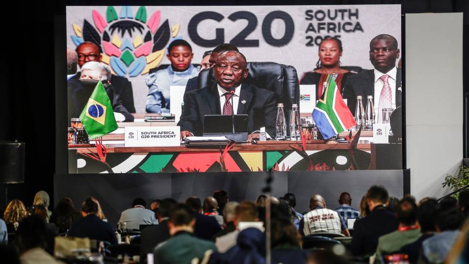 Members of the media follow remarks by South African President Cyril Ramaphosa on a screen in the media centre during the G20 Leaders’ Summit plenary session at the Nasrec Expo Centre in Johannesburg on November 22, 2025. (Photo by GIANLUIGI GUERCIA / AFP)