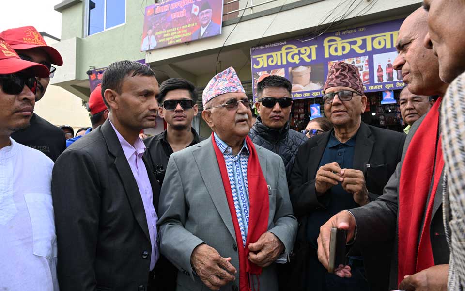 Khadga Prasad Sharma Oli (C), Nepal's former prime minister and Communist Party of Nepal-Unified Marxist Leninist (CPN-UML) leader, speaks to supporters during a door-to-door election campaign rally in Damak, Jhapa district on February 16, 2026. Photo by PRAKASH MATHEMA / AFP
