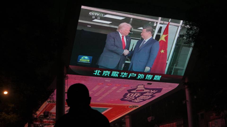 A screen shows news coverage of the meeting between US President Donald Trump and China's President Xi Jinping in South Korea, outside a shopping mall in Beijing on October 30, 2025. Donald Trump and Xi Jinping agreed on October 30 to calm the trade war between China and the United States that has roiled global markets, with Washington cutting some tariffs and Beijing committing to keep supplies of critical rare earths flowing. ADEK BERRY / AFP)