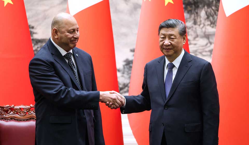 Tonga's King Tupou VI and China’s President Xi Jinping shake hands after a signing ceremony at the Great Hall of the People in Beijing on November 25, 2025. Photo by MAXIM SHEMETOV / POOL / AFP