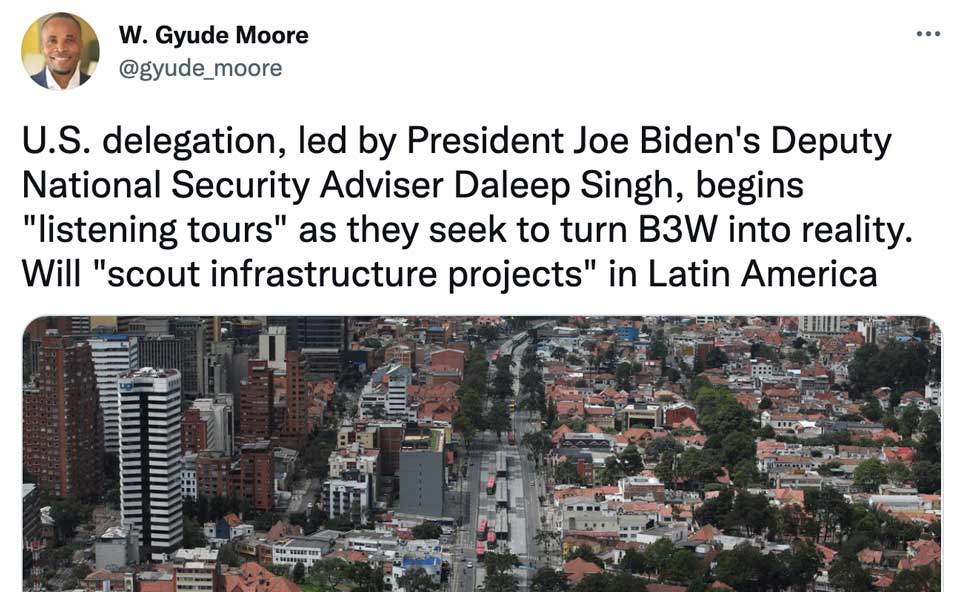 It looks like the U.S.-led Build Back Better World (B3W) initiative that was announced at the G7 summit in Cornwall, England earlier this summer is moving forward and Latin America is going to be the first region where Washington aims to challenge China’s Belt and Road Initiative.