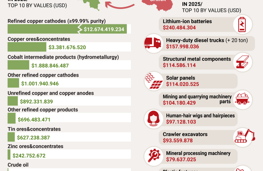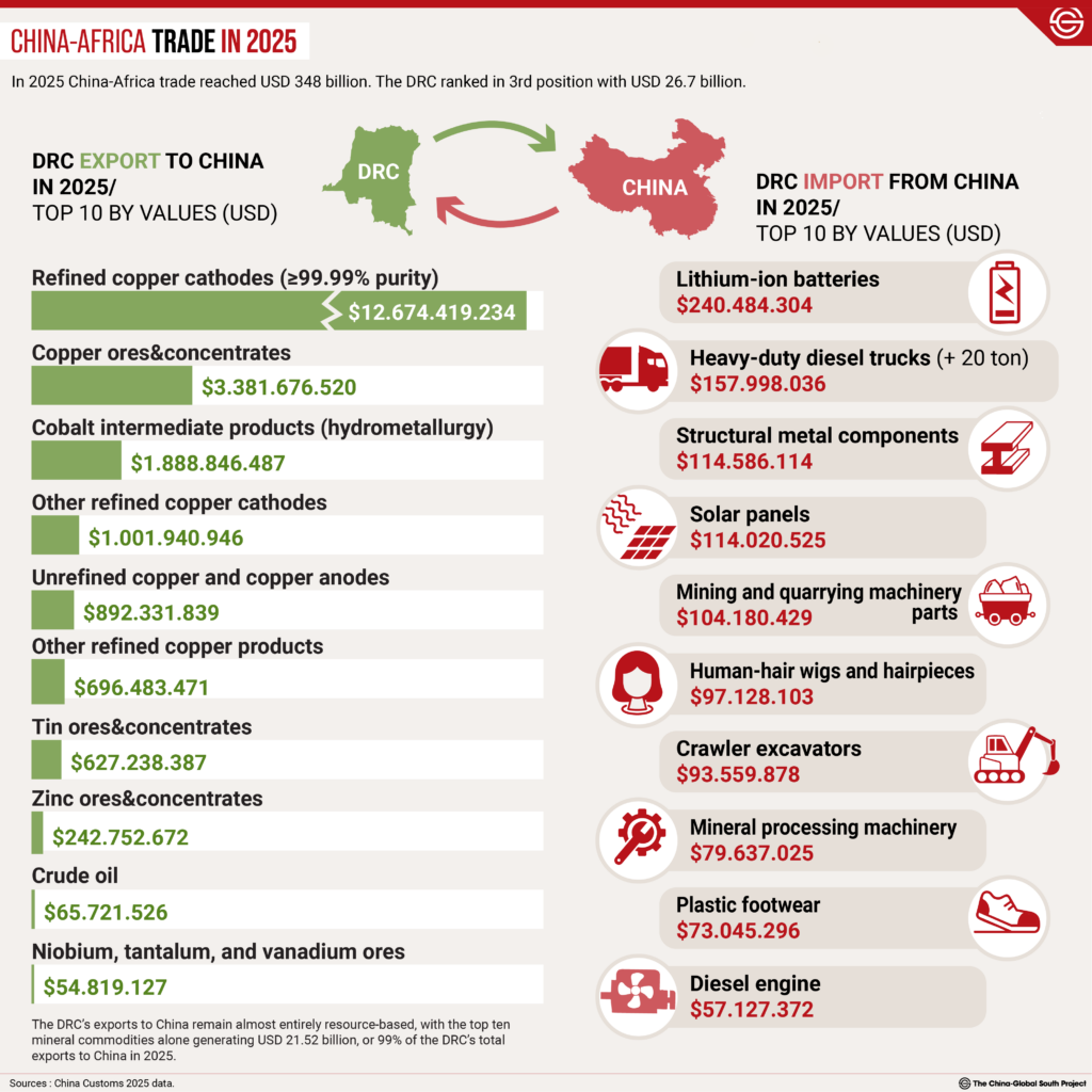 The Democratic Republic of the Congo (DRC) fell to third place among China’s top African trading partners in 2025, with trade totaling $26.7 billion – $5.1 billion in Chinese exports and $21.6 billion in imports from the DRC.