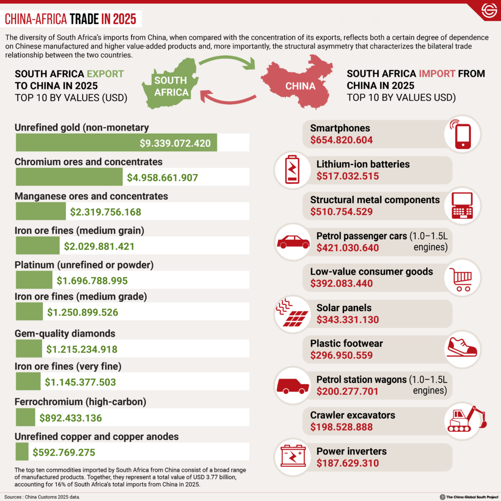 The diversity of South Africa’s imports from China, when compared with the concentration of its exports, reflects both a certain degree of dependence on Chinese manufactured and higher value-added products and, more importantly, the structural asymmetry that characterizes the bilateral trade relationship.