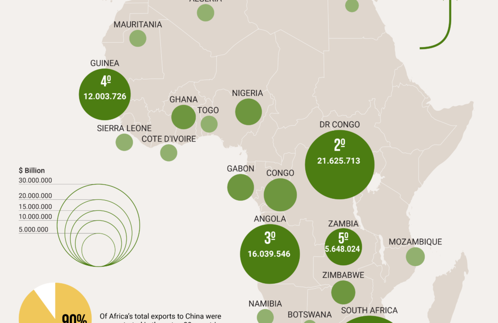 In 2025, 90% of Africa’s total exports to China were concentrated within 20 countries, amounting to $114.5 billion. Of those, three countries — South Africa, the DRC, and Angola — accounted for 55.4% of Africa’s total exports to China.